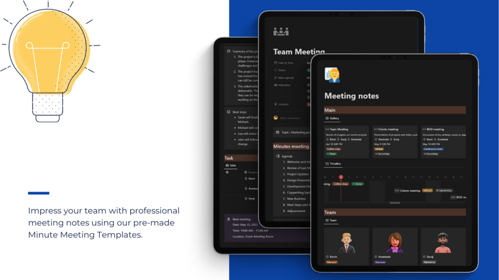 We have built the complete, user-friendly and easy to use Notion template that contain pre-made minute meeting to ensure that you always have all the .skills to organized and manage your meeting well.