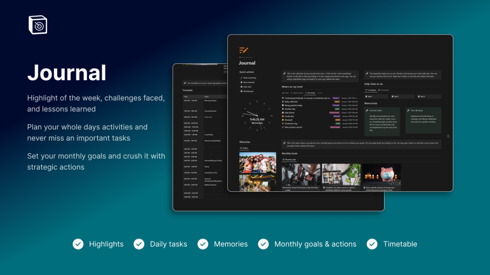Journal Section β Dive into daily reflections, gratitude practices, and goal-oriented journaling. Our dynamic layout provides a visually appealing space to capture your thoughts and experiences, fostering mindfulness and self-awareness.
